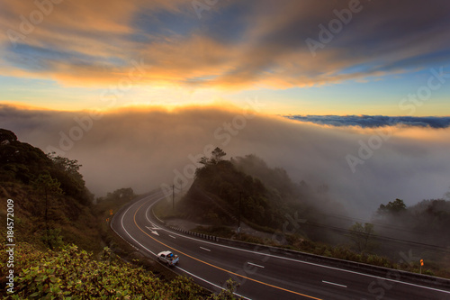 The sea of mist over the mountains and beautiful misty landscape at Doi Inthanon National Park in northern of Thailand, Chiang Mai Province, Thailand