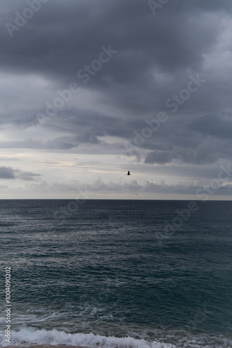 the sea waves at the sandy shore, beating against the rocks. A sailboat at sea. A pigeon sky over a blue sea.