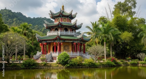 pagoda, lake, chinese, architecture, building, water, landscape, nature, travel, tour tourism, culture, asia, sky, cloud, tree, greenery, scenic, outdoors, tranquil, serene, peaceful, mountain, duck pond, garden, temple, landmark, destination, heritage, historical, sightseeing, vacation, holiday, idylli, oriental, traditional, structure, exterior, daytime, view, scene, foliage, plant, vegetation, flora, environment, park, recreation, relaxation