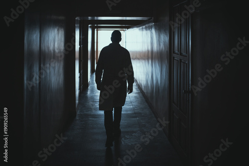 The silhouette of a doctor walking down a dark hospital corridor toward the light. A symbol of hope and healing, faith in miracles, a doctor saving lives, a diagnosis not a death sentence.