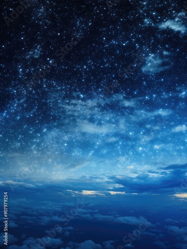 The sky is blue with a few clouds and stars. The stars are scattered throughout the sky, creating a peaceful and serene atmosphere