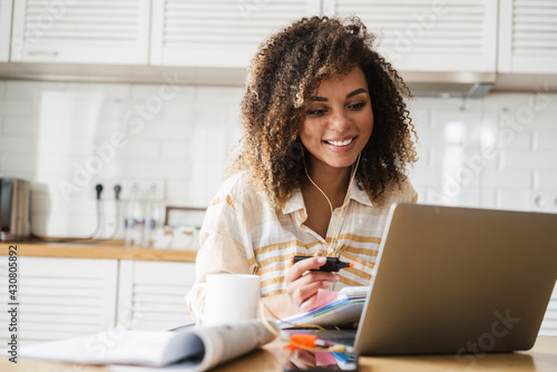 woman, adult, young, black, to sit, cup, smile, laptop, wired, morning, earphones, write, happy, earphones, paper, table, positive, marker, monitor, kitchen, shirt, jean, indoor, 1, freelance, work