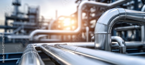 pipeline, pipeline, pipe, pipe, stainless, steel, metal, industrial, refinery, factory, plant, petrochemical, oil, gas, engineering, infrastructure, piping, tubing, shiny, polished, chrome, machinery, production, industry, energy, manufacturing, construction, technology, equipment, installation, closeup, perspective, foreground, detail, sunset, sunlight, flare, clean, panoramic