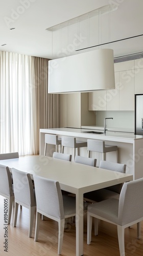 kitchen, dining, area, modern, minimalist, apartment, white, cabinet, wood, flooring, refrigerator, sink, grey, chair, flower, contemporary, bright, open, concept, interior, design, home, decor, appliance, living, space, natural, light, cosy, stylish, urban, furniture, table, setting, colours, scheme, floral, arrangement, ambience, workspace, bar, stool, ventilation, ergonomic