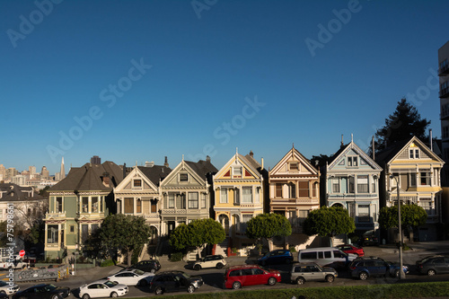 house, painted, colours, architecture, building, row, street, window, roof, skyline, skyscraper, car, tree, sidewalk, hill, frisco, california, us