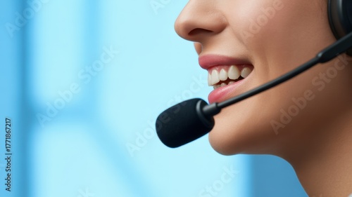 The Voice of Assistance: A close-up shot of a customer service representative, their radiant smile and attentive expression radiating warmth as they assist a customer through a headset microphone.
