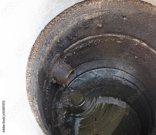 The water is flowing from the drain in concrete septic tank of lavatory, Waste water treatment system of house