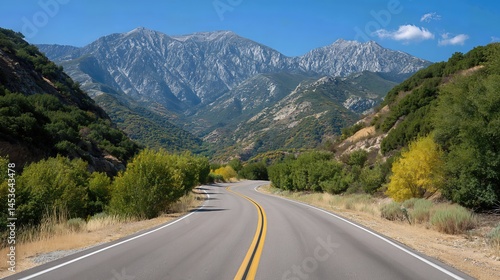 The winding road through the mountains stretches into the distance, offering a perfect setting for a road trip, with breathtaking views along the way.