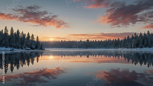 The winter sunset casts vivid colors across the tranquil lake with snow covered trees lining its edges creating a peaceful atmosphere at dusk