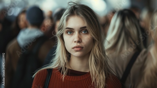 woman, fashion, travel, portrait, person, girl, autumn, city, people, jean, blond, young, street, crowd, urban, model, female, serious, face, casual attire, lifestyle, modern, emotion, human, jacket, trendy, sharpened, adult, background, looking, public, beautiful, expression, downtown, attractive, destination, individual, gaze, candid, day, tied-up, scene, perspective