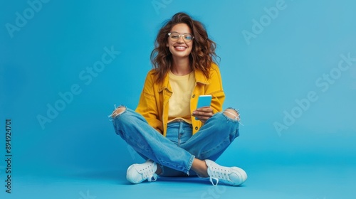 happy, technology, woman, happiness, fun, smiling, goggles, portrait, fashion, confident, phone, cute, joyful, jean, person, yellow, young, cheerful, blue, fresh, relaxed, casual attire, modern, white, jacket, holding, beautiful, connection, communication, sitting, lifestyle, trendy, stylish, sneaker, positive, bright, lady, isolated, attractive, pretty, energetic, footwear, casual clothes, wearing