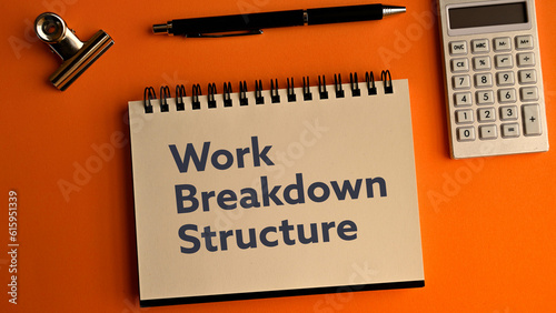 There is notebook with the word Work Breakdown Structure. It is as an eye-catching image.