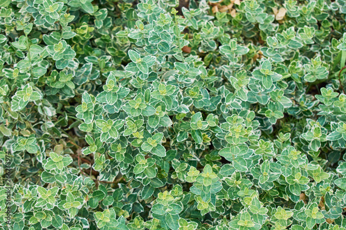 Thick green bushes grow in garden.