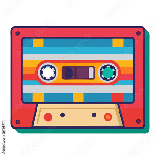 This artwork features a brightly colored music cassette tape showcasing a playful design with stripes and buttons. It represents the nostalgia of physical music formats