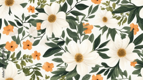 This background with a beautiful pattern of orange and white Asoka flowers and green leaves creates a warm and alluring atmosphere, adding a refreshing and uplifting touch of beauty.