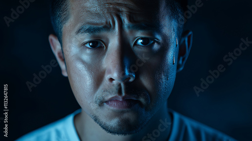 This close-up portrait features a pensive young Asian man captured in low light, showcasing his thoughtful expression and emotional depth, making a striking visual impact.