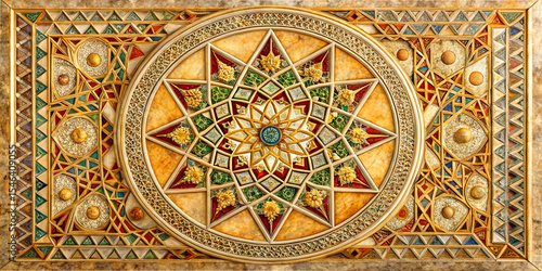 This detailed mural showcases a captivating geometric star pattern with elaborate floral motifs. The vibrant colors and textures create a stunning display of artistry and craftsmanship