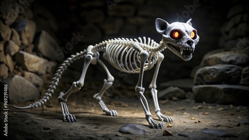 skeleton, decoration, skittish, white, glowing, eye, figurine, illustration, haunted, supernatural, fantasy, horror, creepy, gothic, occult, mysterious, autumn, seasonal, frightful, fearsome, ghoulish, grisly, eerie, ominous, foreboding, bony, cadaver, undead, morbid, spine