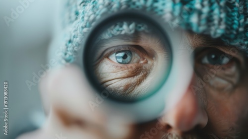 This image captures a close-up of a person’s eye seen through a magnifying glass, emphasizing the intricate details, textures, and colors of the eye and skin.