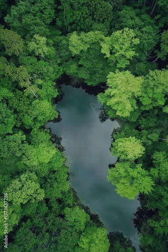 This image depicts a lush tropical rainforest with dense canopy and a serene body of water at its center. The scene is representative of the diverse flora and fauna found in such ecosystems.