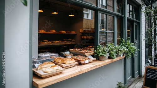 This image shows a bakery with breads and pastries displayed through the large windows. The counter is made of wood, and the storefront exterior is painted in a dark green shade.