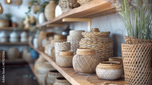 This image shows a close-up of shelves in a shop displaying a collection of woven baskets and ceramic jars in various shapes and sizes.