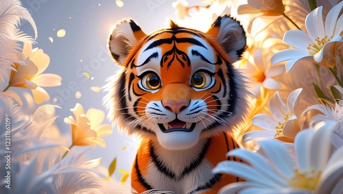 This image shows a tiger cub with a cheerful and curious expression. This tiger is depicted in a highly detailed and realistic 3D style, with soft, bright orange fur, distinctive black stripes and shi