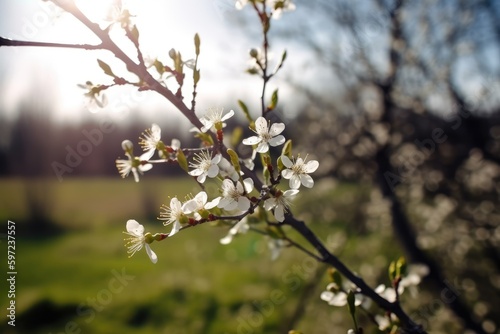 This photo captures the stunning beauty of spring with blooming cherry blossom trees. Generative AI