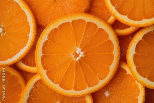 This photo features slices of fresh orange fruit arranged as a top view background. Generative AI