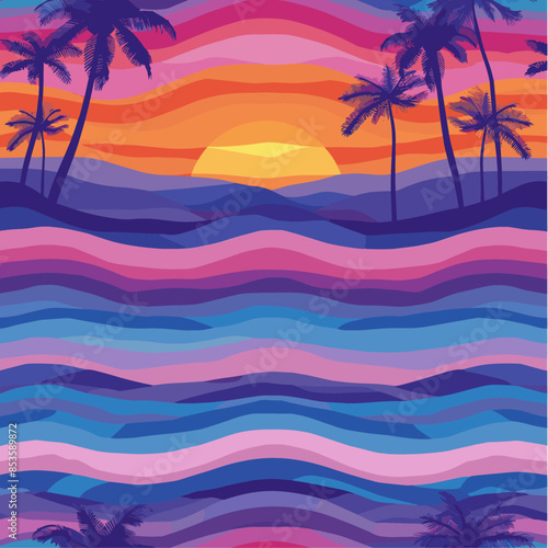 This seamless pattern features a vibrant tropical sunset with palm trees silhouetted against a colorful, wavy sky and ocean. The bold hues of orange, pink, purple, and blue create a dynamic and eye-ca