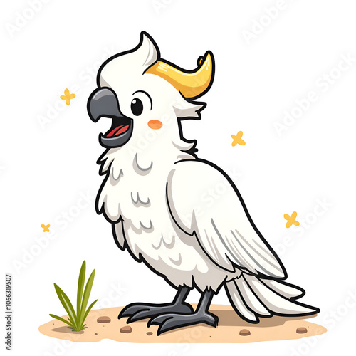 This vibrant cockatoo spreads joy through its playful presence and charming smile, digital illustration of character design concept.