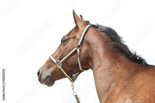 beauty, breed, bridle, chestnut, close, closeup, collar, domestic animals, ear, equestrian, equine, equus, gallop, gelding, hair, isolated on white, lariat, farm animal, look, mammal, mane, mare, neck, pasture, portrait, posed, posing, racing, ranch, rein, stable, fast horse, standing, trotting, western, white background, wild, pony