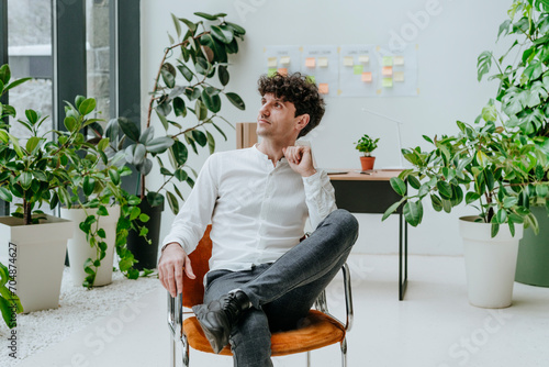 thoughtful, businessman, sitting, chair, office, sustainability, copy space, 1, people, adult, business, man, day, occupation, job, casual attire, pensive, daydreaming, dreaming, potted plants, plant, leaf, green, mid, contemplation, caucasian, looking, entrepreneur, colours, white, male
