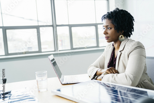 businesswoman, solar panel, model, table, thoughtful, sitting, laptop, window, contemplation, chair, office, business, sunlight, looking away, entrepreneur, communication, solar energy, strategy, renewable energy, responsibility, short hair, black hair, occupation, alternative energy, businessperson, technology, daydreaming, professional occupation, business plan, startup, connection, wireless technology, front view, waist up, indoor, day, one person, mature adult, mature woman, female