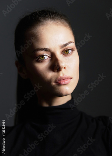 woman, portrait, beauty, confidence, elegance, thoughtful, black, turtleneck, hair, gaze, young, eastern european, minimalist, exploration, introspection, calm, serene, dark, model, studio, expression, face, natural, emotion, fashion, simple, style, photo, creative, artistic, lighting, contrast, sophisticated, chic, appearance, closeup, attractive, focused, personality, skin, young adult, modern, lifestyle, youth, inner peace, captivating, allure
