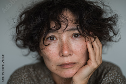 thoughtful, mature, woman, curly, freckle, contemplative, gaze, hand, resting, expression, face, introspective, hair, solemn, eye, deep, skin, texture, serious, emotion, portrait, isolated, sharpened, pensive, individual, mood, detailed, closeup, feature, melancholic, introspection, serene, peaceful, natural, authentic, warmth, subtile, gentle, delicate, calmness, presence, moment, solitude, quiet