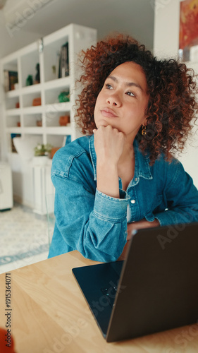 woman, latin america, hispanic, contemplation, concentration, portrait, head shot, indoor, indoor, home interior, room, home office, desk, laptop, computer, denim, jean, casual clothes, curly hair, wavy hair, coiffure