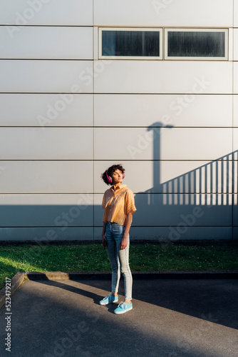 Thoughtful woman with headphones standing in front of wall