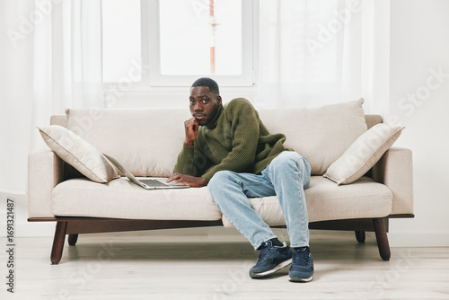 man, young, black, laptop, couch, home, sweater, jean, thoughtful, concentration, productivity, modern, interior, comfort, sharpened, sitting, casual attire, lifestyle, home office, professional, inspiration, technology, working, indoor, serious, contemplation, relaxation, furniture, studying, leisure, contemporary, quiet, brainstorming, cosy, creativity, connection, environment, fashion, solitude, eltern, communication, design, space, habit, idea, planning, workspace, seasonal, feeling
