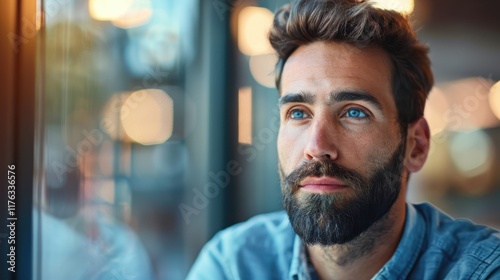 Thoughtful young man with beard gazes out of window, contemplating life, with soft lighting creating a warm and intimate atmosphere in a modern cafe