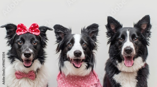 border, collie, dog, dog, pet, pet, adorable, cute, happy, smiling, white, black, pink, polka, dot, bow, attaching, animal, animal, dressed, costume, fashion, fluffy, fur, eye, tongue, playful, portrait, group, three, look, gazing, camera, background, photo, image, picture