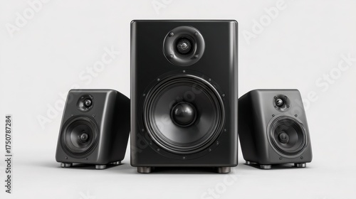 Three audio speakers are set up together showcasing a compact design. The larger speaker is in the center flanked by two smaller ones all designed for rich sound quality.