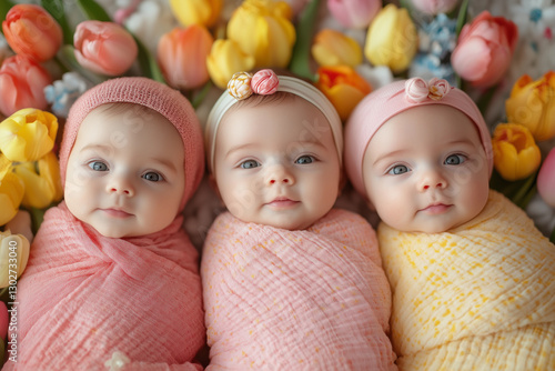 three baby dolls are posed in front of a flower arrangement of tulips and tulips in a row