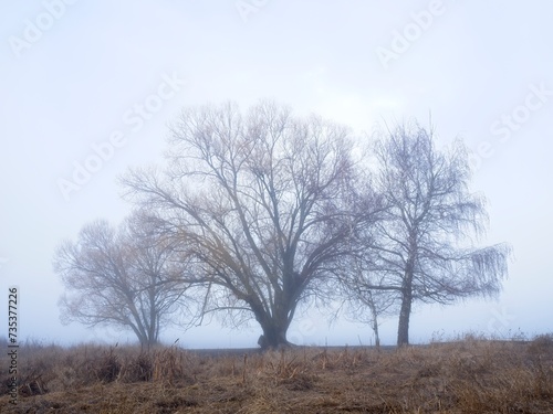 Three barren trees on a foggy morning.
