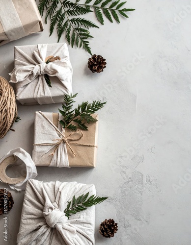 Three beautifully wrapped presents adorned with rustic twine and charming pine cones, set against a cozy backdrop, evoking a festive holiday spirit.