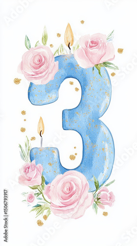 number, three, three, birthday, celebration, watercolor, rose, pink, flower, candle, floral, illustration, art, design, greeting, card, invitation, anniversary, party, event, decoration, ornament, festive, gold, glistering, leaf, green, blue, romantic, beautiful, elegant, creative, style, drawing, hand, painted, craft, aesthetic, bloom, blossom, joy, happiness, childhood, symbol, age, growth, youth