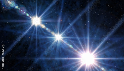 Three bright stars shining in the dark blue galaxy space 紺碧の宇宙空間に輝く3つの星と光のイラスト デジタルイラスト