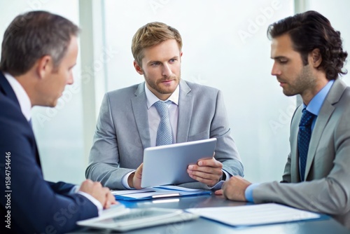 man, office, meeting, business, tablet, computer, adult, suit, attaching, document, indoor, corporate, discussion, businessman, technology, team, three people, communication, professional, strategy, teamwork, workplace, analysis, collaboration, finance, manager, leadership, planning, solution, presentation, project, copy space