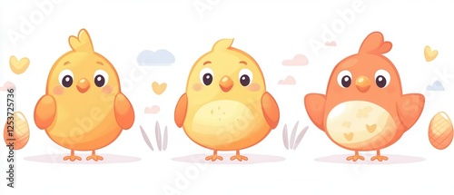 Three cheerful cartoon chickens stand side by side, surrounded by colorful hearts, conveying a sense of friendship and joy in a playful atmosphere.