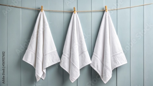 Three clean white towels hang neatly on a clothesline against a soft blue wooden wall, creating a fresh and minimalist aesthetic.
